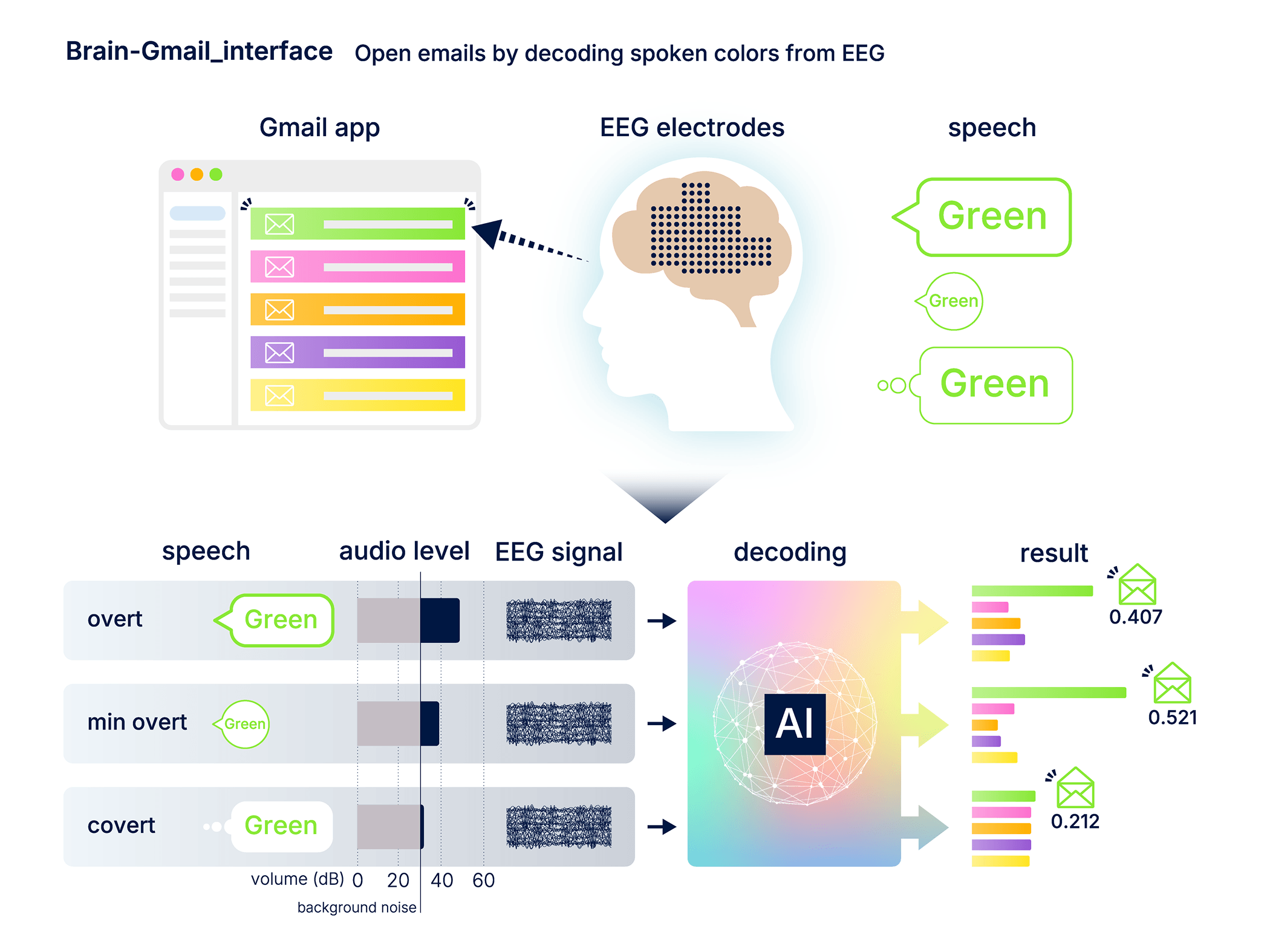 Using 5 color words decoded in real-time from 128-channel ultra high density EEG, we demonstrated end-to-end BCI-controlled Gmail navigation: participants selected emails to open, chose ChatGPT-generated reply candidates, and confirmed sending — using only EEG signals from spoken color words.