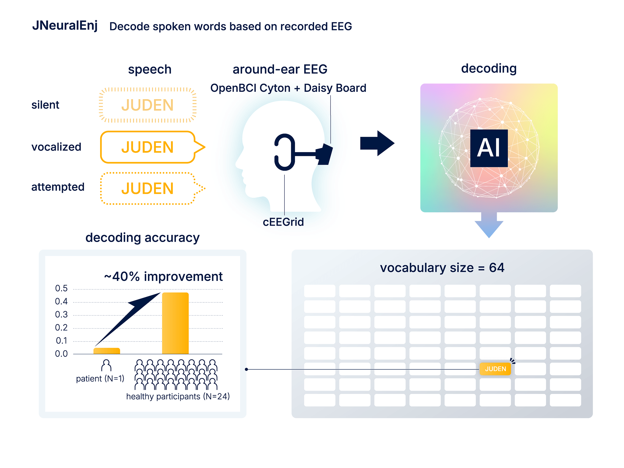 Population-scale pretraining benefits individual users. Using compact around-ear EEG (cEEGrid electrodes) with an OpenBCI Cyton + Daisy Board, we decoded spoken words from a 64-word vocabulary across three speech conditions (silent, vocalized, and attempted speech). Training on data from 24 healthy participants instead of a single patient produced a ~40 percentage-point improvement in decoding accuracy (~0.05 → ~0.45), demonstrating that large-scale population data substantially improves individual decoding performance — including for patients with speech impairments.