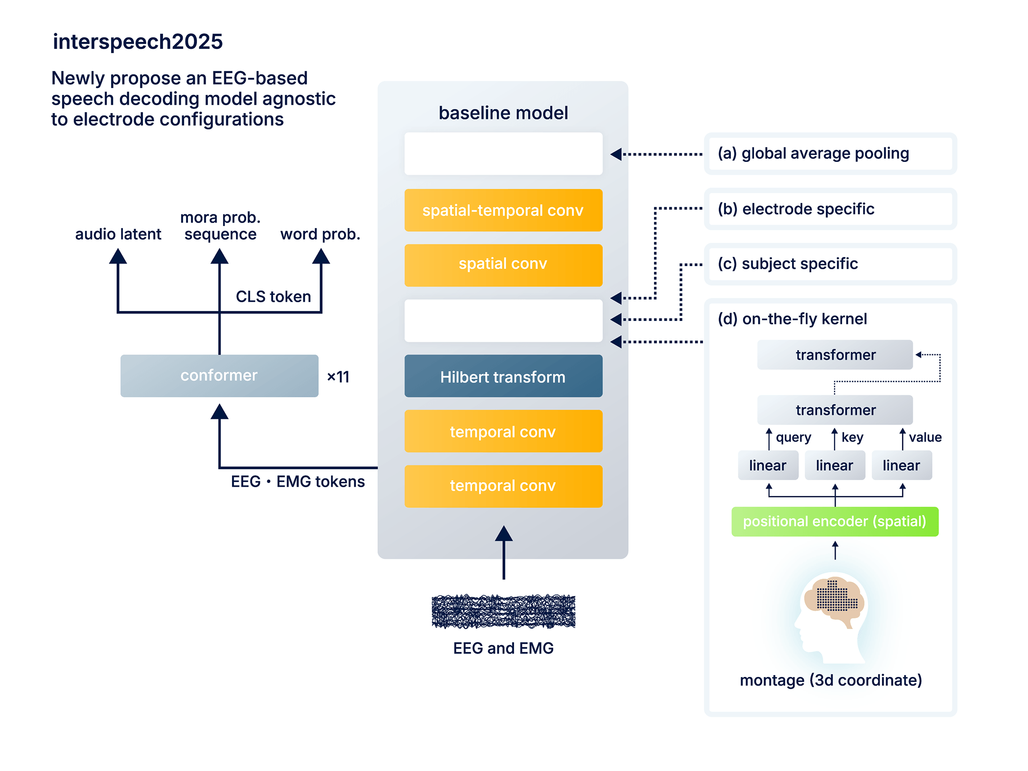 A newly proposed EEG-based speech decoding model that is agnostic to electrode configurations. Unlike conventional approaches requiring fixed electrode placement, this model adapts to arbitrary montages via a spatial positional encoder trained on 3D electrode coordinates.